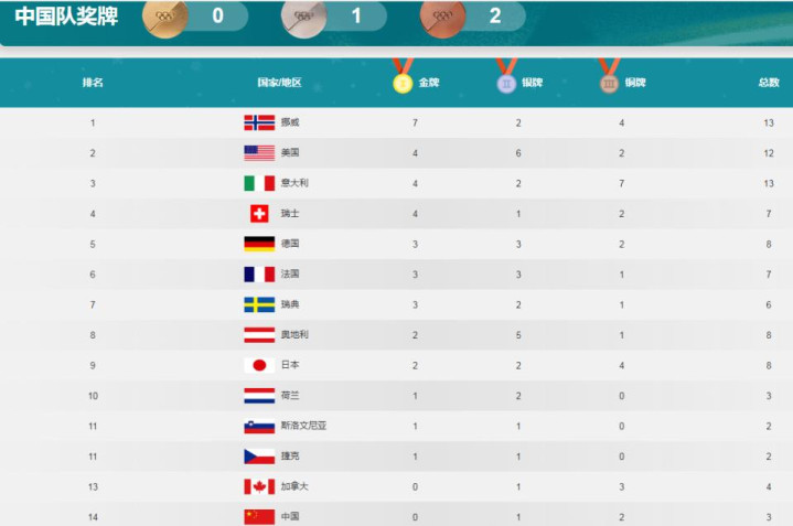 廉子文被取消成,宁忠岩则没有让人失望,他通过奋力拼搏,以1分07秒34的成绩夺得铜牌,同时创造中国选手在这个项目上的最好成绩。而这枚铜牌,也是中国代表团在本届冬奥会获得的第三枚奖牌。祝贺这位老将!金牌榜上,中国以1银2铜排在第14,挪威是7金,美国和意大利、瑞士均为4金。